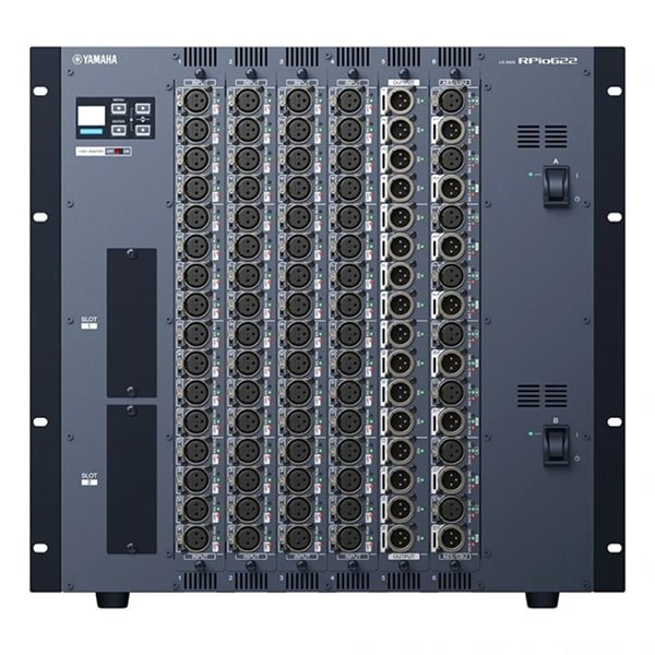 تتميز وحدة I/O RPio622 بستة منافذ لبطاقات RY، مما يوفر مرونة في تكوين وتوسيع مداخل ومخارج الصوت التناظرية والرقمية لأنظمة RIVAGE PM التي تعمل عبر شبكة TWINLANe منخفضة الكمون. كما تحتوي الوحدة على مزودَي طاقة مزدوجين مدمجين لضمان استقرار التشغيل.