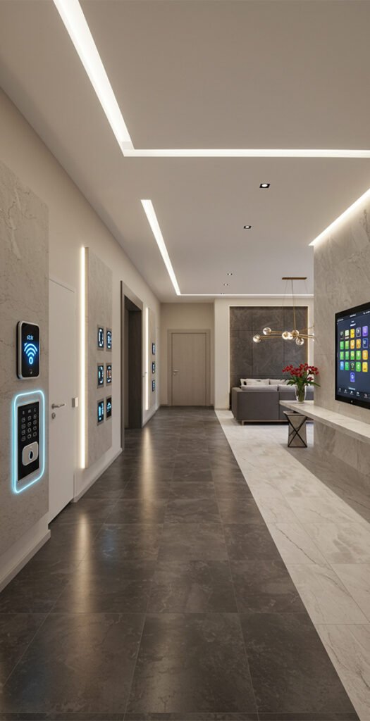 This project showcases integrated access control and smart display panels within a modern interior. The solution enhances both aesthetics and security, ensuring safe and seamless navigation across spaces.